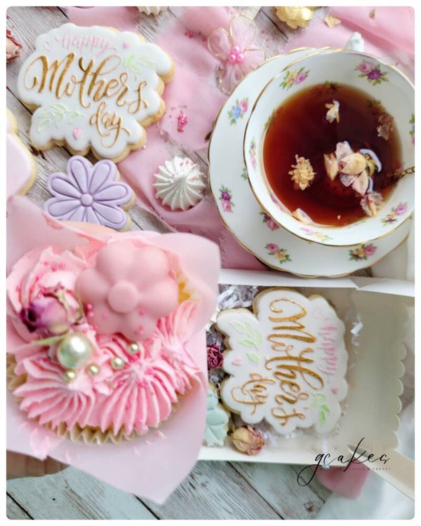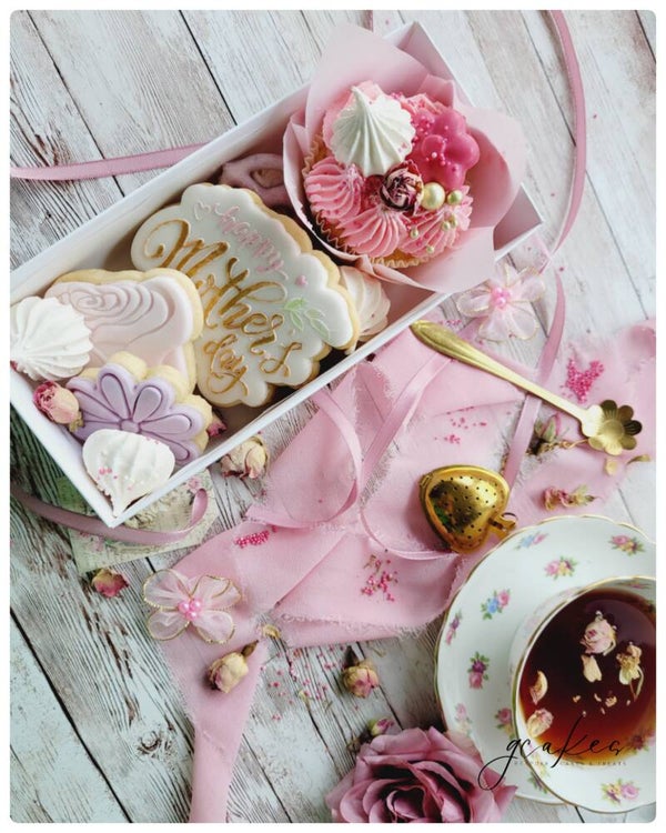 The sweetest treat box ‘just for mum’! Each box contains a vanilla bean cupcake, selection of ‘Mothers Day’ handpainted sugar cookies, mini meringues & pink pretzels.