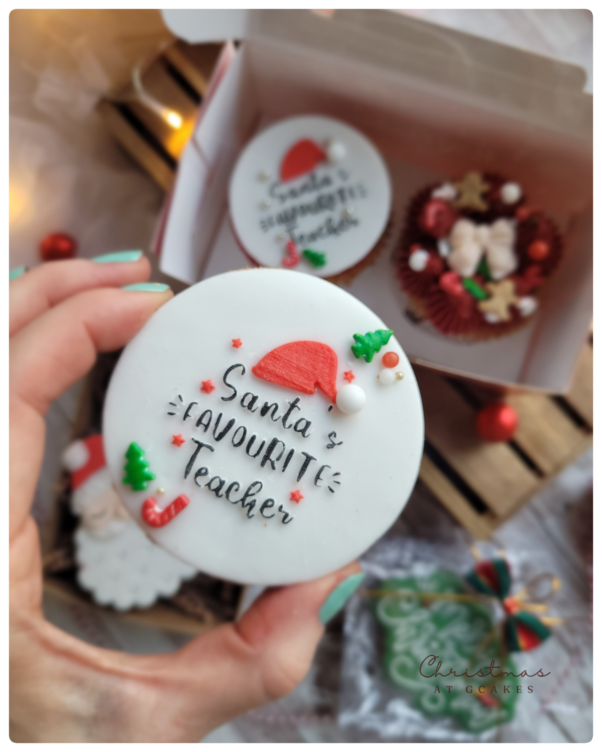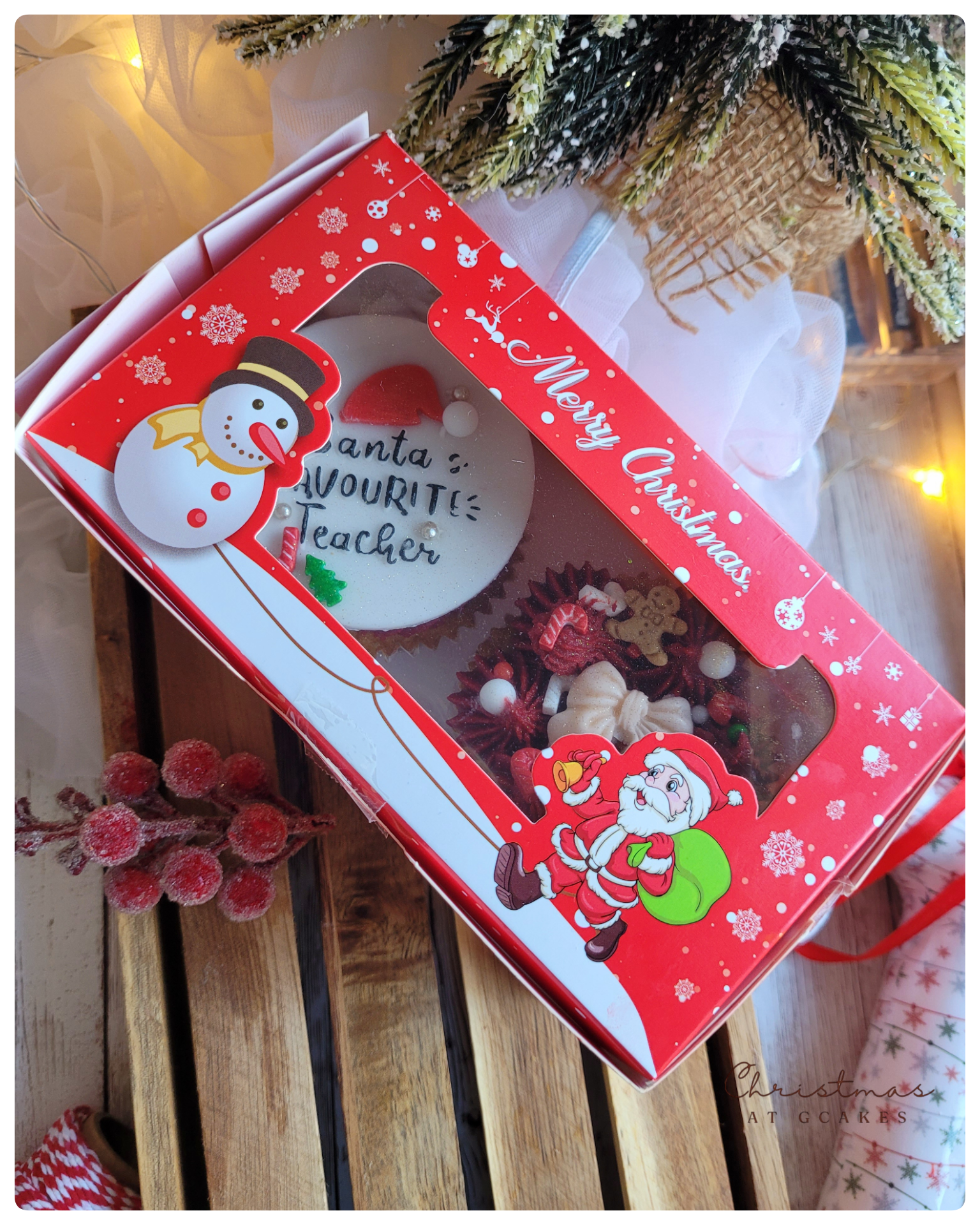 Presented in a fun Christmas cupcake box, finished with ribbon & seasonal tag. Select preferred collection date at checkout.