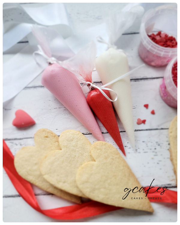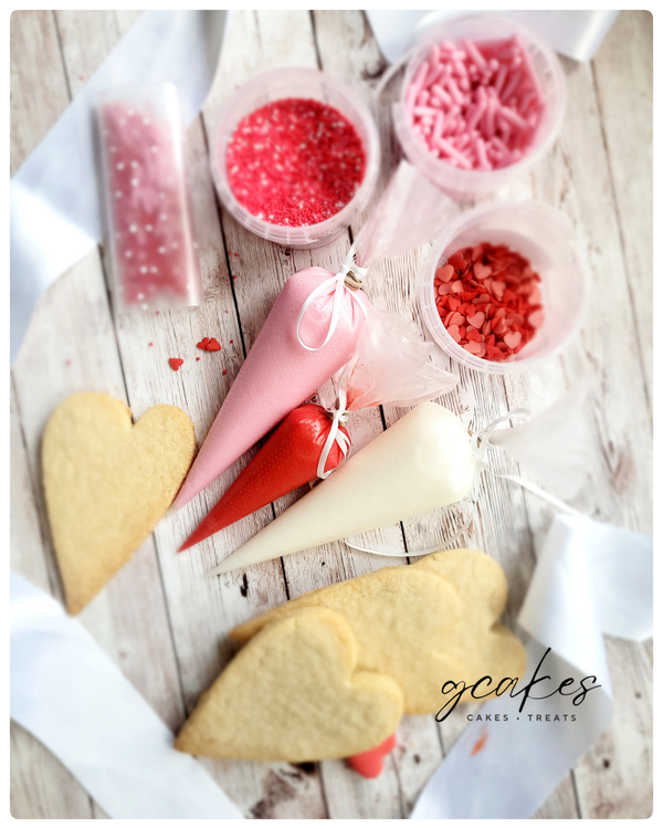 Each kit contains three bags of Royal Icing (white, pink & red for those finer details), four large delicious Love Heart vanilla bean cookies, sprinkles & instructions.