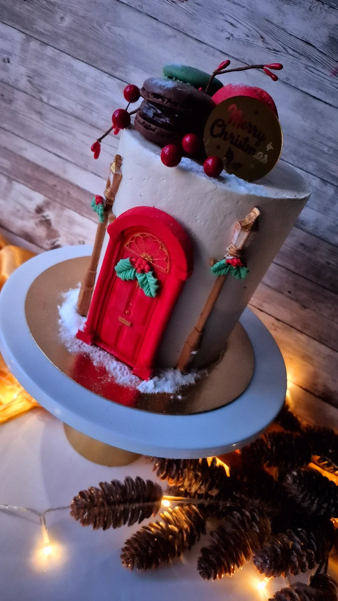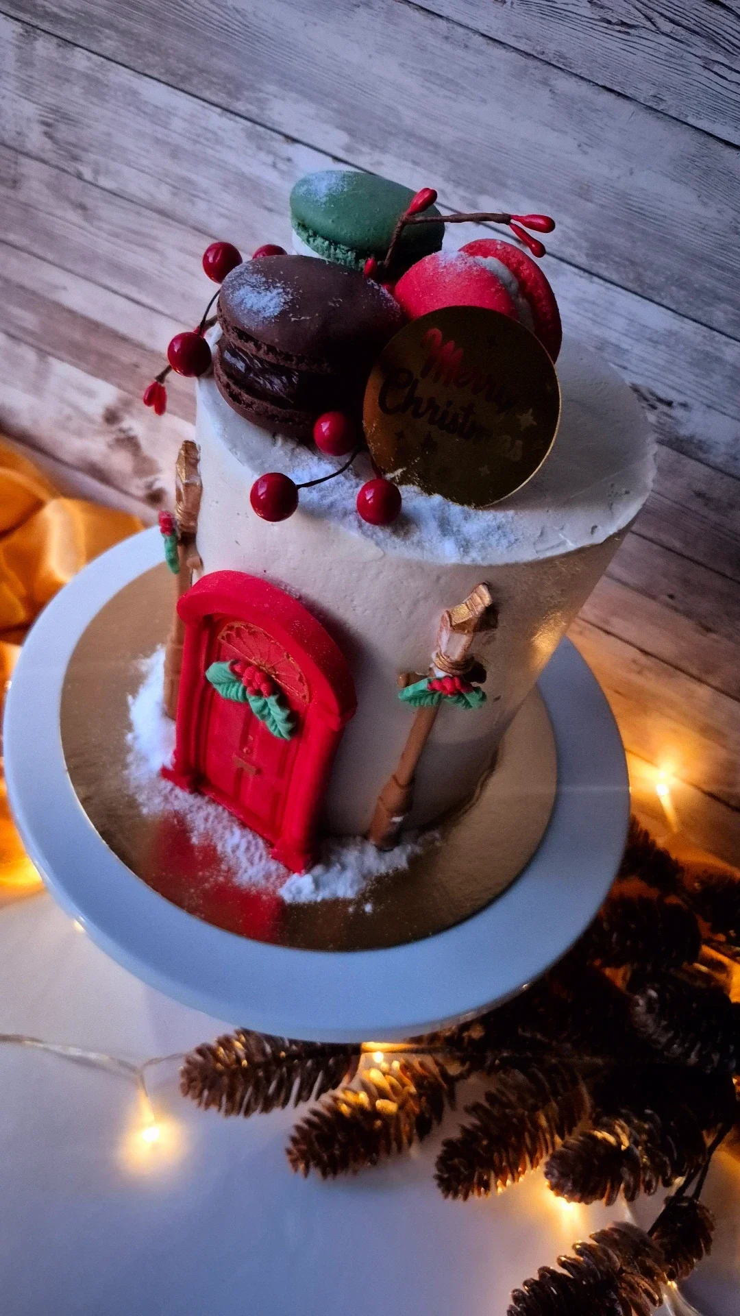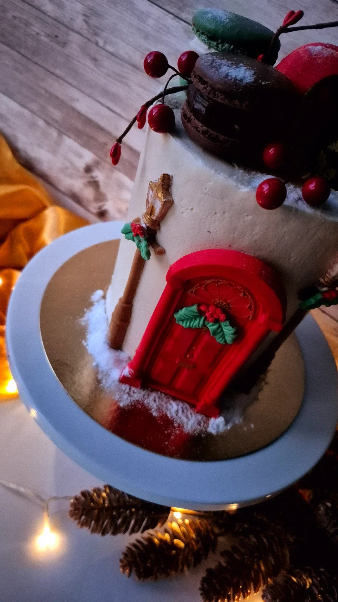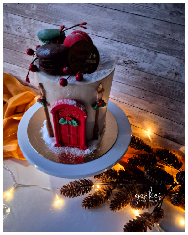 Each cake is artfully decorated with a festive fondant door, edible snow, and festive street lamps, then topped with three of my signature handcrafted macarons for the perfect finishing touch.