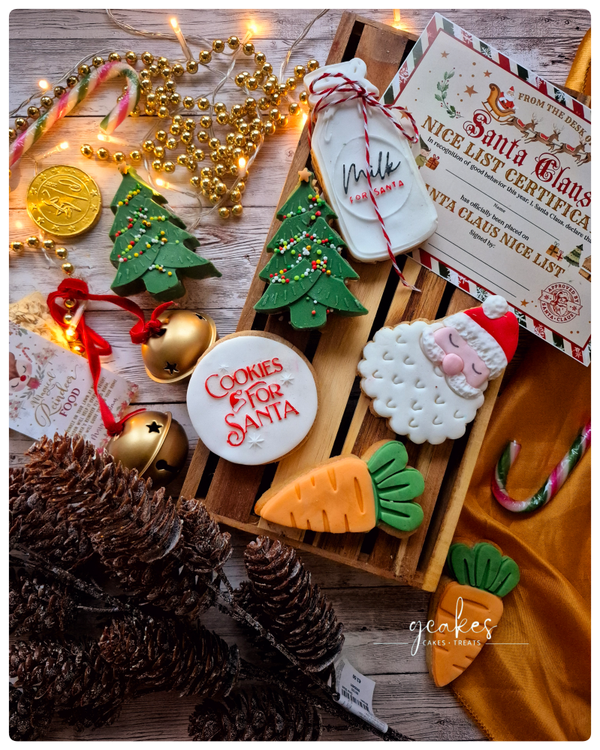 Each box is filled with festive joy, including beautifully decorated holiday cookies, cookie 'carrots' for Rudolph, two chocolate Rice Krispie Christmas trees, chocolate coins, and a classic candy canes.