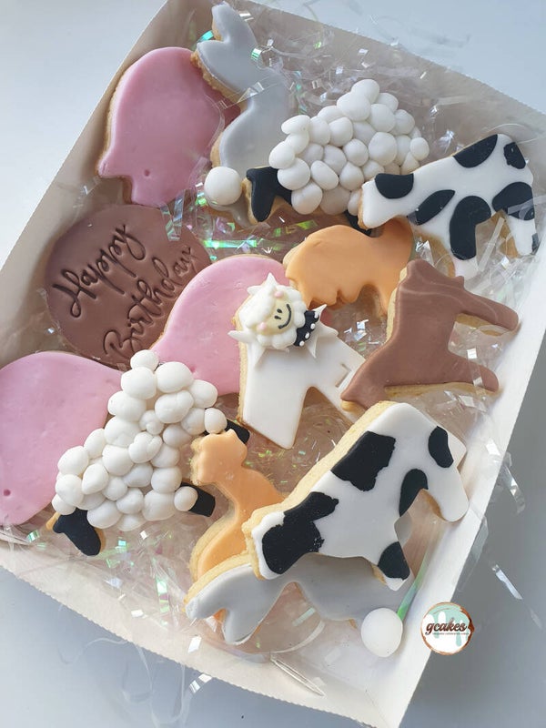 A gorgeous 'Down on the Farm' themed vanilla cookies. Perfect for that 1st Birthday! A lovely gift from nanny/grandad/aunt/uncle. Each biscuit is decorated by hand using fondant and edible paints & colouring.