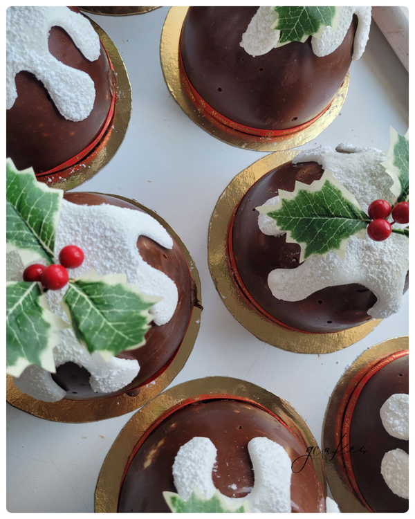 Made with the finest Belgian Chocolate both milk and dark, each pud contains Digestive, Rich Tea Biscuits, Gingernuts and Maltesers for that extra crunch. Decorated with fondant 'drip' signature holly & berries each pud is also finished with a ribbon around base.
